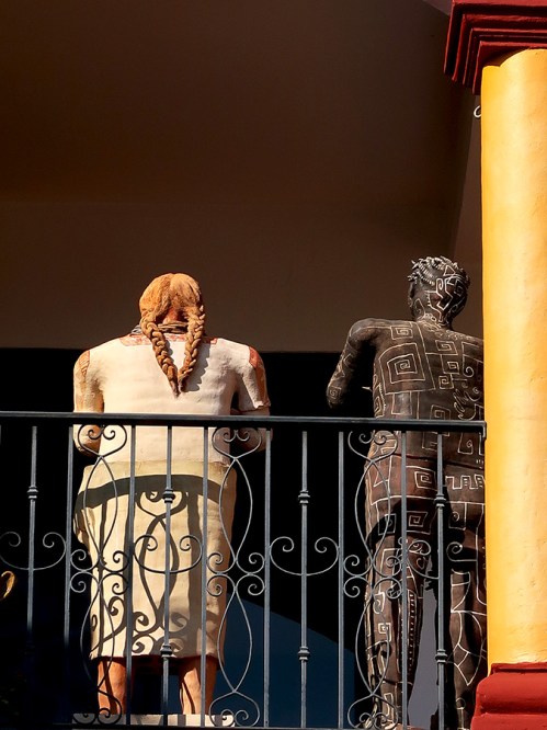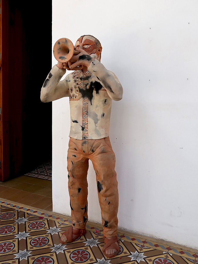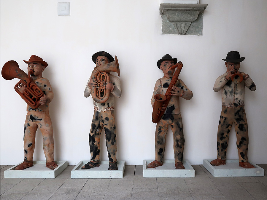 Sculptures depicting musicians of the Mixe mountain village, Santa María Tlahuitoltepec, in the courtyard of Andares del Arte Popular. Sculptures by Sculptor Na’pë Jääy — an artist from Tlahuitoltepec.