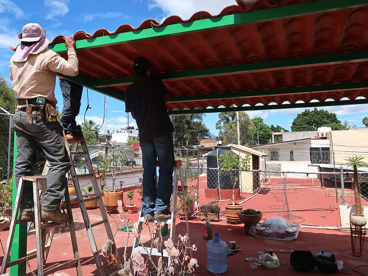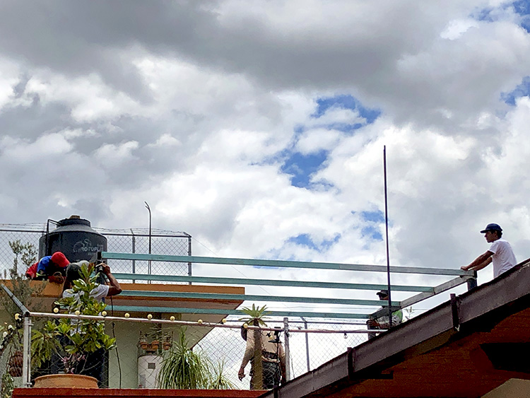 The space. The view. What an improvement! However, that wasn’t the end of the story. Do you see those four posts sticking up from the deck? Because the deck faces south, those were for a much-needed shade structure. Alas, Juan also has a “day” job at Gorilla Glass and they have gotten extremely busy. Good for them, bad for me! After I returned from the trip to the US in late February, I began a search for someone to complete the project. Tom (a friend’s husband) came to the rescue. He designed the structure, recruited Carlos and his assistant Chivo to build it, selected the materials, delivered said materials and crew, and supervised construction. Needless to say, I owe Tom big time!