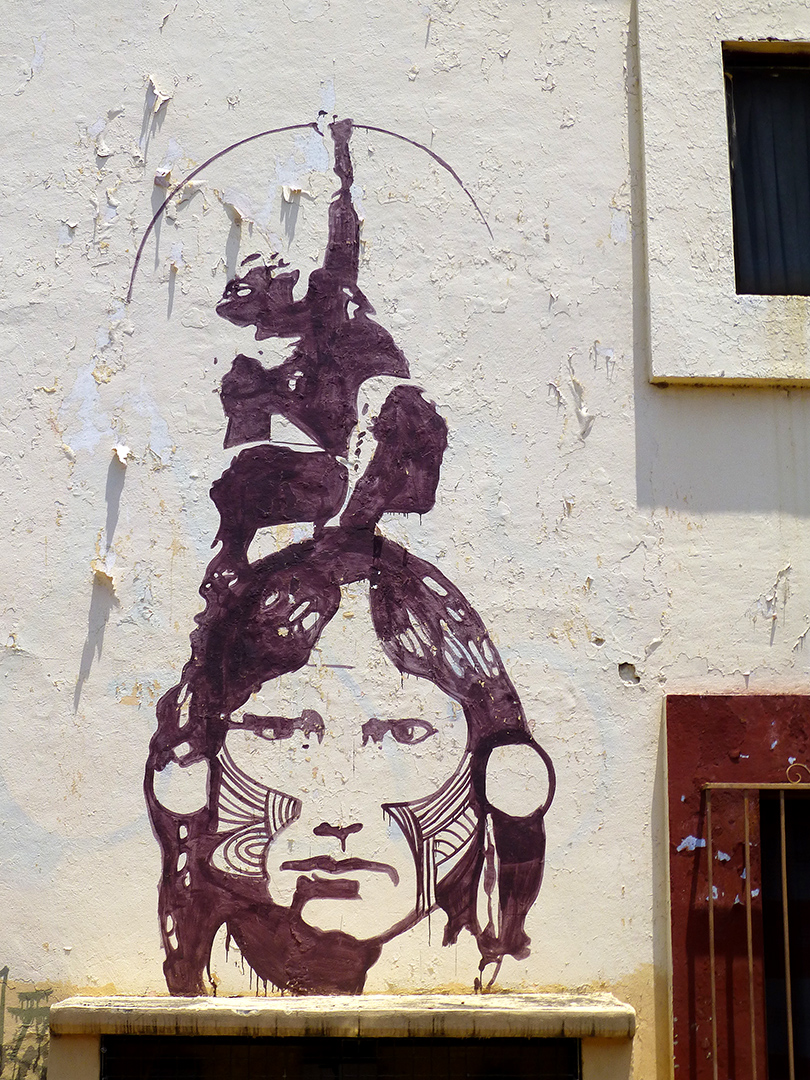 Popping some gum in my mouth (didn’t want my breath to smell like I’m a lush), I headed south on Tinoco y Palacios to catch a couple of new murals I’d had fleeting glimpses of when returning from last Sunday’s trip to Tlacolula. This one had particularly caught my eye.