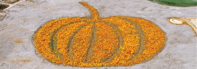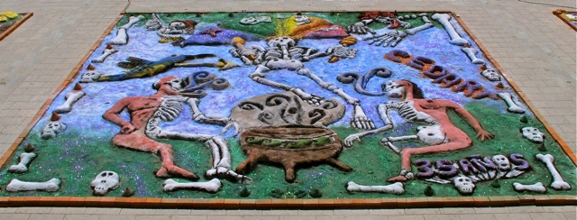 Interestingly, in previous years the themes of the sand paintings in these public spaces have been Día de Muertos related. I’m not sure of why the change this year to religious imagery. Indigenous Day of the Dead celebrations pre-date the arrival of the Spanish and the All Saints Day of the Catholic church. And in Oaxaca, one of the most indigenous states in Mexico, as Shawn D. Haley points out in his book, Day of the Dead: When Two Worlds Meet in Oaxaca, “there is little of the Spanish influence to be found in the Oaxacan Day of the Dead. The Spanish version… is bleak and dismal…. For the Oaxaqueñans, these days are… joyous and exuberant. It is not a mourning of lost loved ones, but a celebration, a reunion with the dead.”