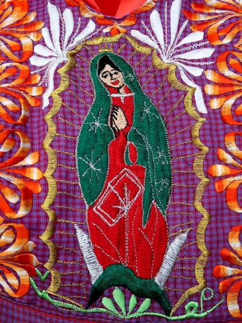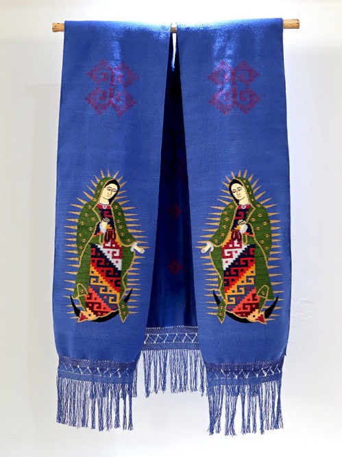 The Virgin’s appeal continued to deepen when Linda moved to Oaxaca in 1997.  Thus the seeds/threads of the exhibition, “Rosas y Revelaciones: Homage to the Virgin of Guadalupe by Mexican Textile Artists” were sown/sewn.