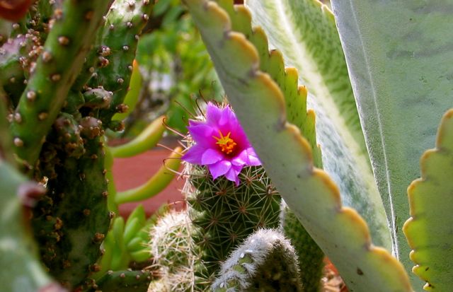 The 112 containers, from 6″ to 24″ pots and 30″ x 8″ x 8″ planter boxes decorating my entry and terrace, are brimming with one to twelve succulents and cacti. They are watered weekly with gray water — shower water, dish water, and rain water, the latter when and if it ever rains again! Oh, and then there are the 2 bougainvillea, 1 plumbago, 1 gardenia, 1 geranium, and pot of herbs, which require watering two to three times per week in this 90+ degree heat. Water is an especially precious resource here in Oaxaca and we tenants must pay for all water deliveries to our compound. So, in order to nurture my garden, everyday I haul buckets and dish-pans out through the terrace gate to my collecting barrel, a 32-gallon (not so sweet-smelling) plastic garbage can. The plants don’t seem to mind the hand-me-down, fetid, murky water — in fact, they appear to love it!