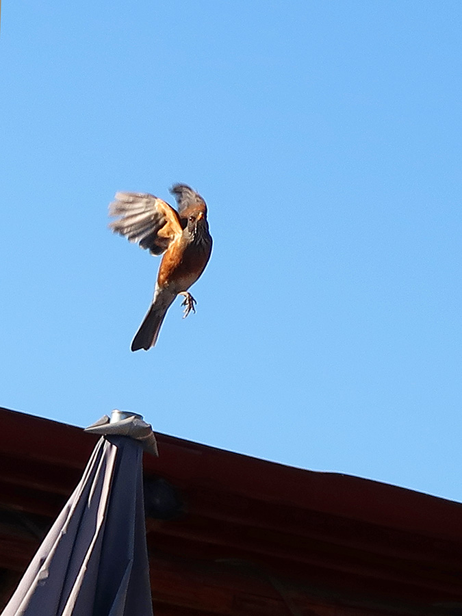 An added bonus, besides (hopefully) filtering at least some of the exhaust from the diesel buses that race each other up the hill, the vegetation attracts a host of critters — giant friendly bumbling black bumblebees zeroing in on blossoms; geckos skittering across the pottery and terrace walls in the morning and afternoon, catching their breakfast and dinner; large brown crickets that like hang out in my “greens” recycling basket, not minding or even moving when I add more spent flowers and cuttings; and birds, including my home’s namesake colibrí, flitting back and forth across the terrace, chasing insects and sipping nectar from cactus and succulent flowers.