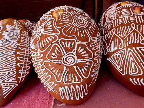 When Día de Muertos approaches, the panaderías (bakeries) work overtime to fill their shelves and counters with Pan de Muertos — an egg based bread, sometimes elaborately decorated, but always with a cabecita (also known as a muñeca), a little painted flour dough head, at the top.